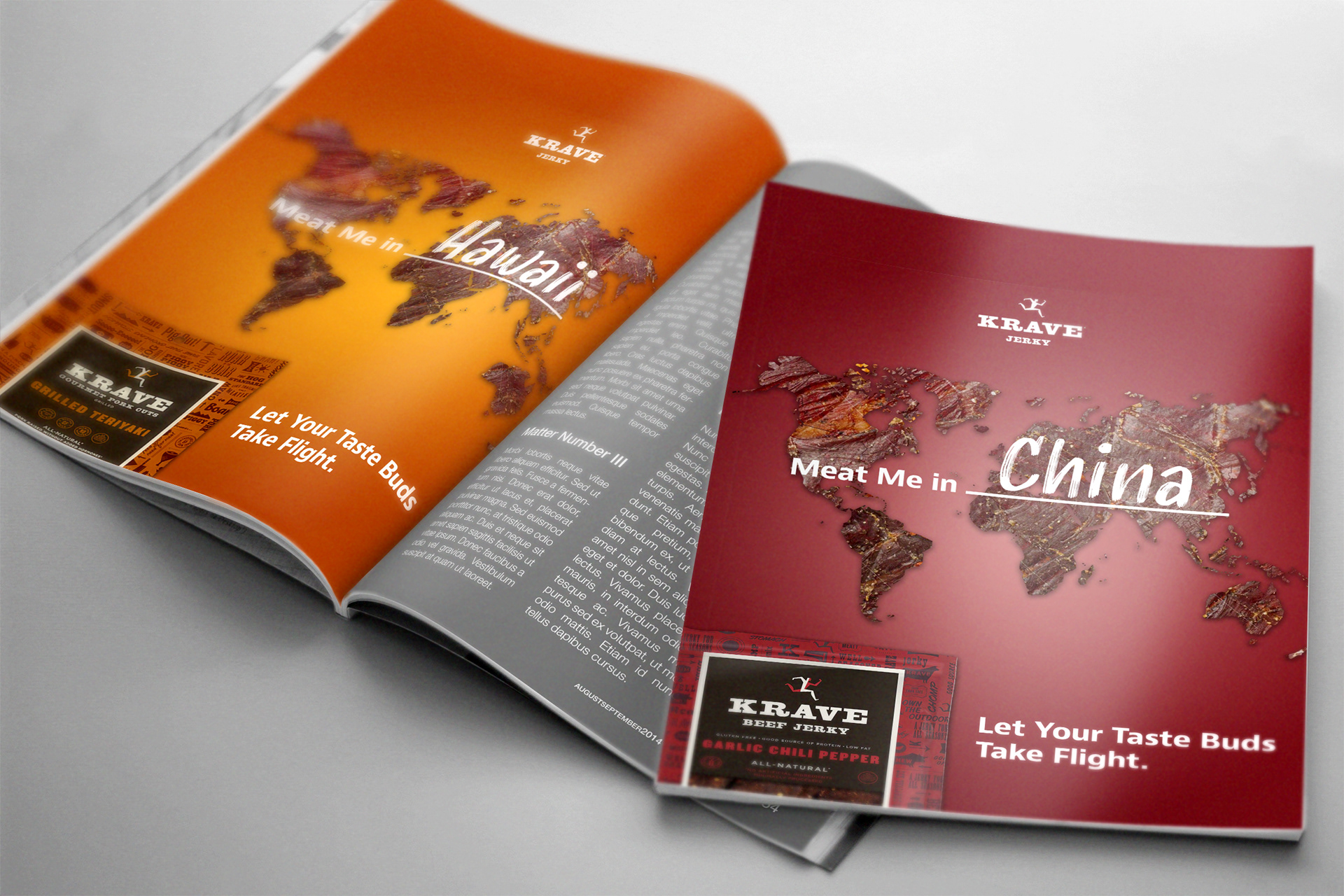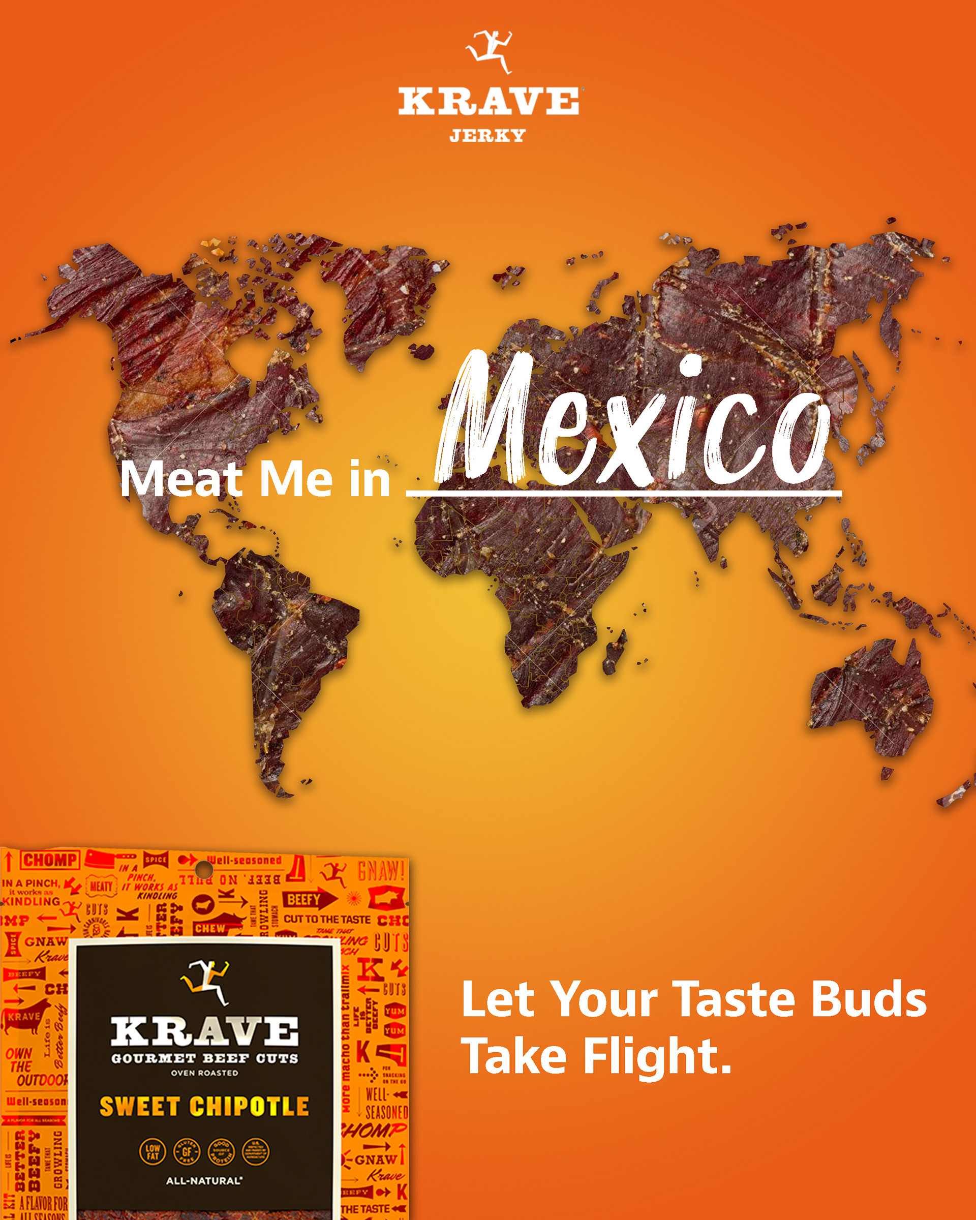 Krave Jerky is a snack brand offering a variety of globally inspired flavors. The campaign concept, “Meat Me In…”, paired each flavor with a country name to highlight its international influences, such as “Meat Me in China” for garlic and chili pepper. Each ad features the tagline “Let your taste buds take flight,” reinforcing the sense of adventure and flavour exploration.
